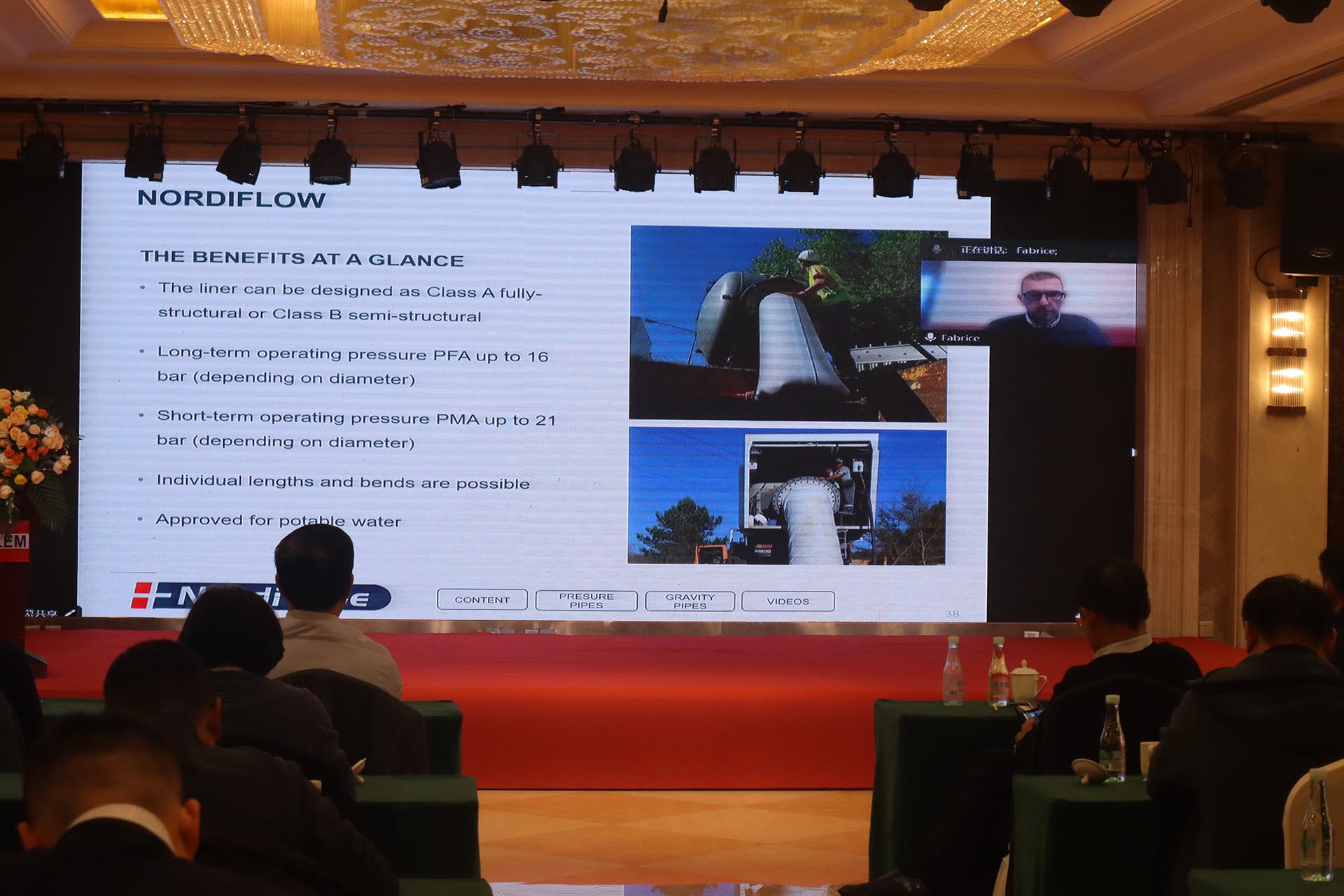 五行科技股份有限公司執行總裁徐宏衛代表五行全體員工,歡迎所有領導、嘉賓和行業同仁的蒞臨。緊接著,五行科技管網非開挖更新技術全球技術總監 Fabrice Pirotte通過連線對話,并發表專題演講《管網非開挖更新一站式解決方案》。